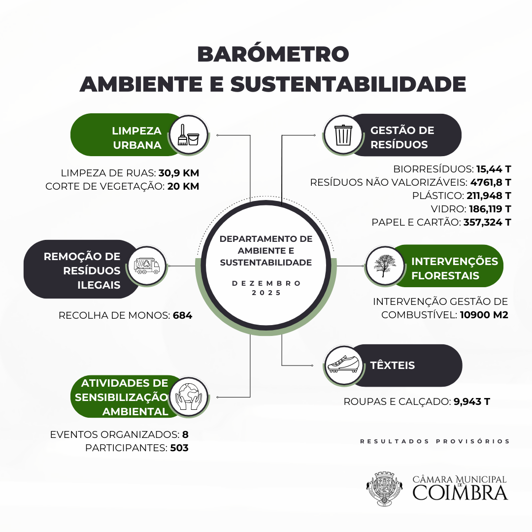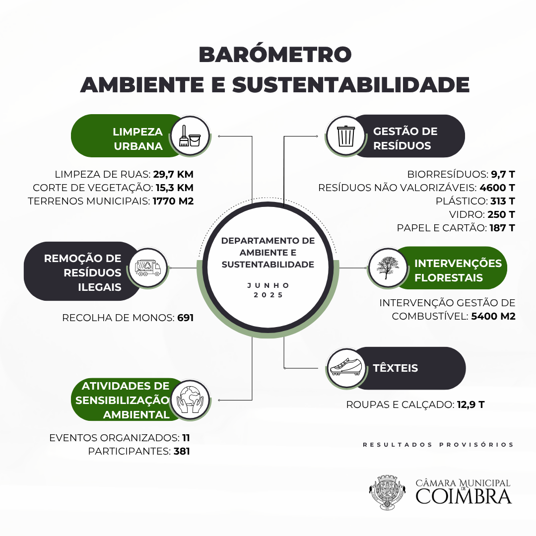 A Câmara Municipal (CM) de Coimbra divulga, regularmente, o Barómetro do Ambiente e da Sustentabilidade, com o objetivo de reforçar a transparência e a comunicação com os cidadãos. Esta rúbrica pretende dar a conhecer os indicadores mensais das intervenções dos serviços municipais nas áreas da gestão de resíduos, da limpeza urbana, da recolha de monos, das intervenções florestais e de atividades de sensibilização ambiental, sublinhando assim o compromisso da CM de Coimbra para com a proteção ambiental e a promoção da sustentabilidade, em complemento com o reporte mensal na área da limpeza urbana. Estas ações garantem a qualidade de vida dos cidadãos e a sustentabilidade do município, contribuindo para um ambiente mais limpo e saudável. Está prevista a evolução do presente barómetro incorporando novos indicadores.